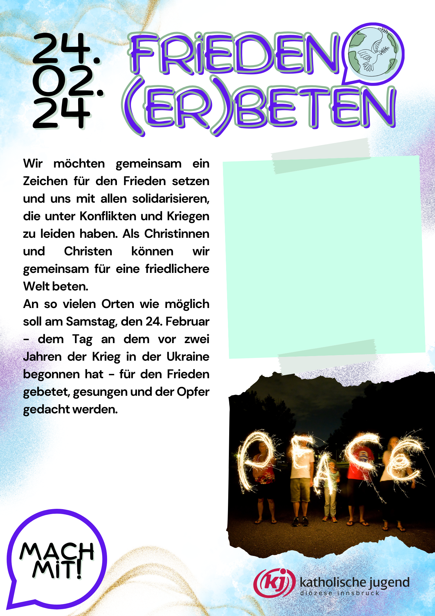 Sei dabei und veranstalte ein Friedensgebet an einem Ort deiner Wahl. Die Handreichung und weitere Materialien (siehe Downloads) dienen als Hilfe und Inspiration.